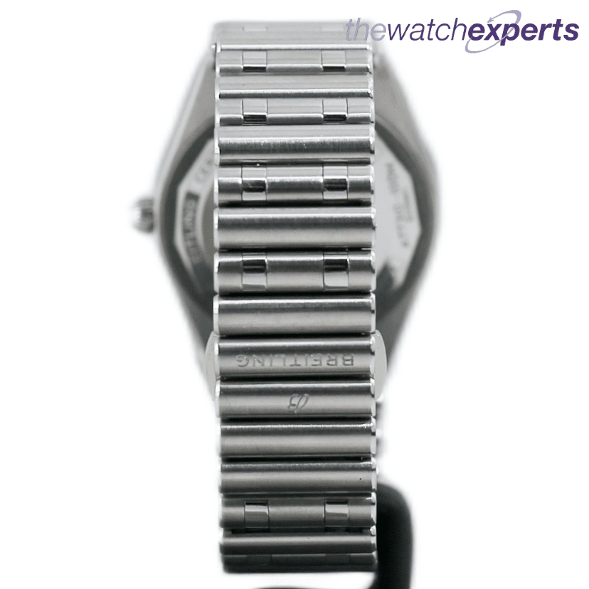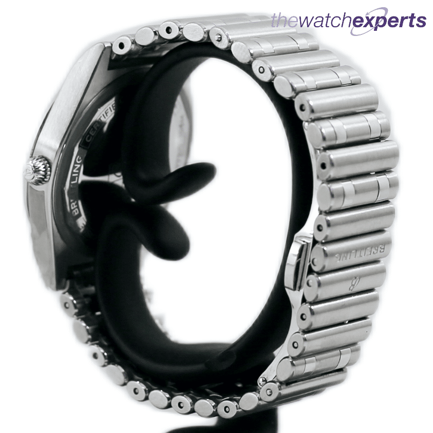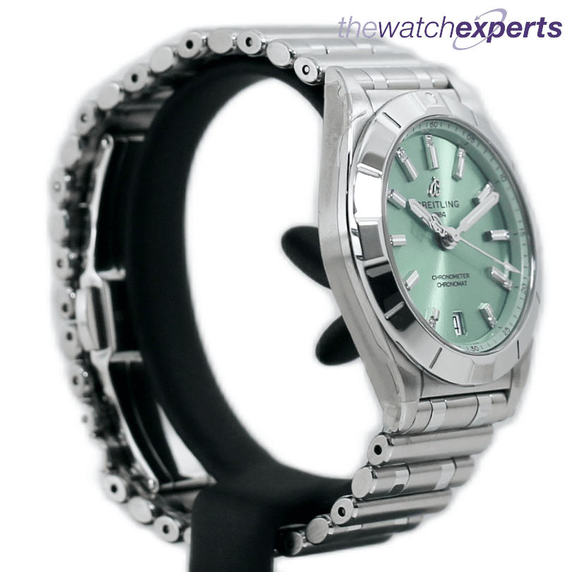 The 32mm stainless steel case with fixed steel bezel houses a Swiss quartz movement with green dial, diamond indices and date aperture. The bracelet sits at 179mm on the wrist which includes the 4 additional spare links. Please note the watch is photographed with the protective cover on the side of the case.