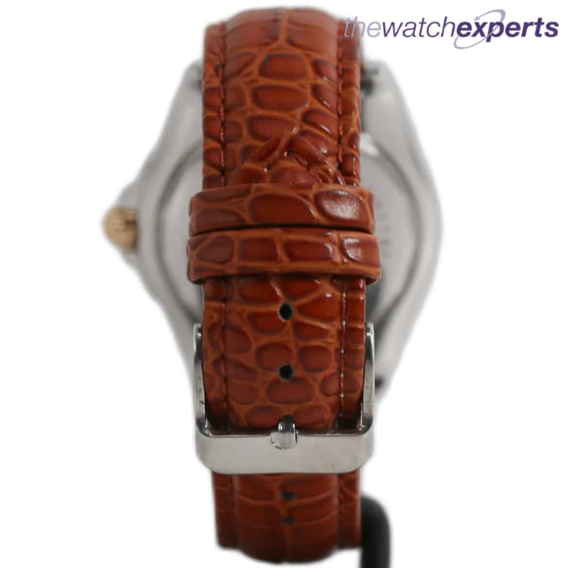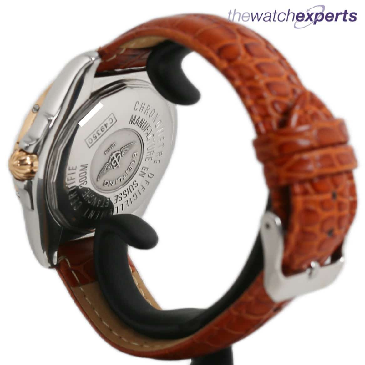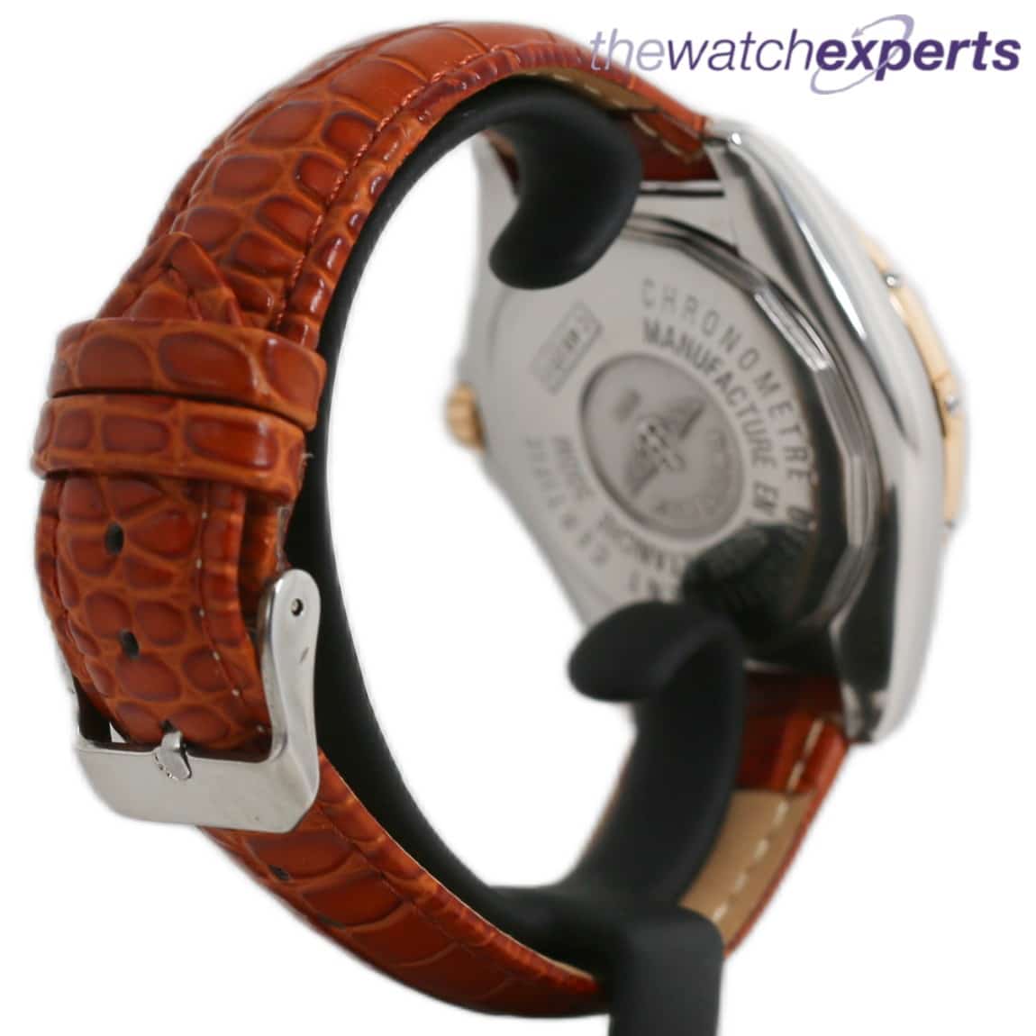 The 41mm stainless steel case with 18k gold, diamond set, unidirectional bezel house a Breitling automatic movement with diamond dot and mother of pearl dial with date aperture.The aftermarket alligator grain leather strap with steel buckle sits at 210mm at maximum length.