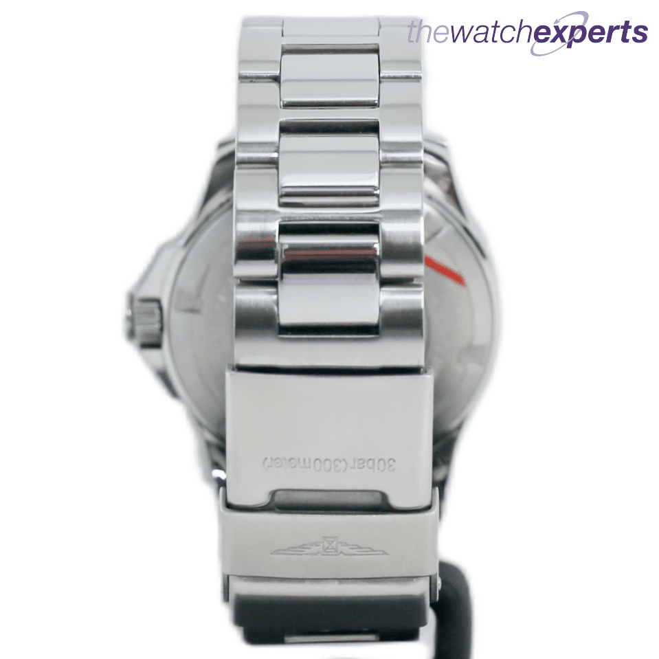 The 39mm stainless steel case with black steel bezel houses a swiss quartz movement with black dial, date aperture and uni directional bezel. The bracelet sits at 170mm on the wrist, not including the divers expansion.
