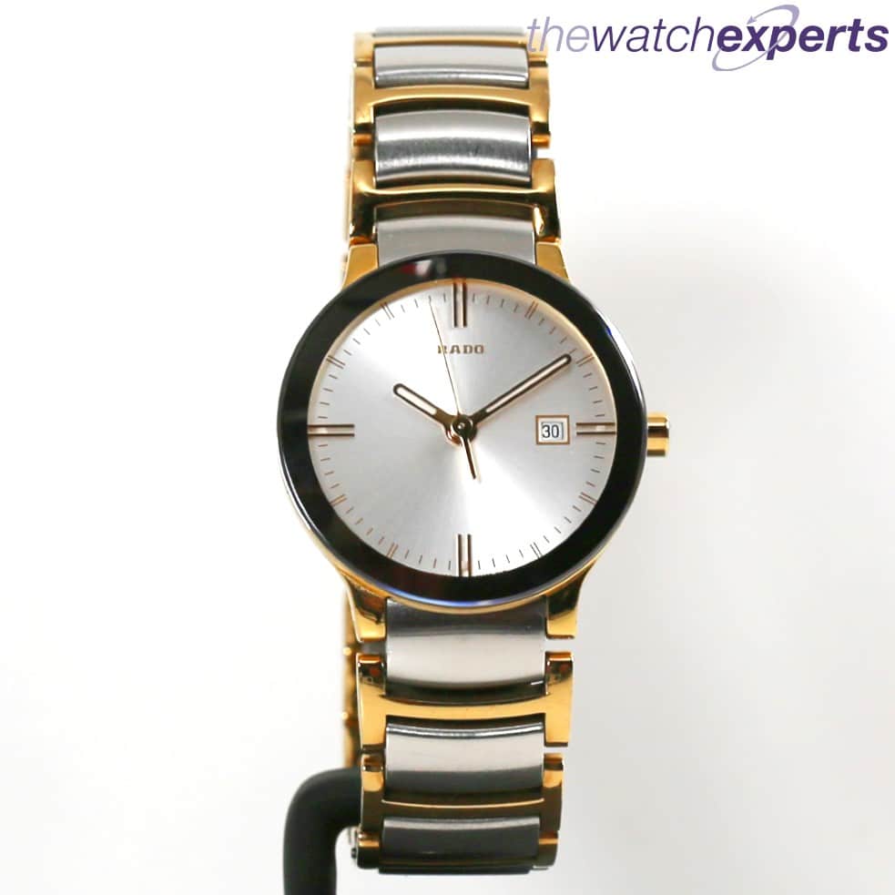 The 30mm Gold PVD and steel case houses the Swiss Rado quartz movement with silver dial and date aperture. The Steel and gold PVD and double fold clasp sits well at 165mm on the wrist.