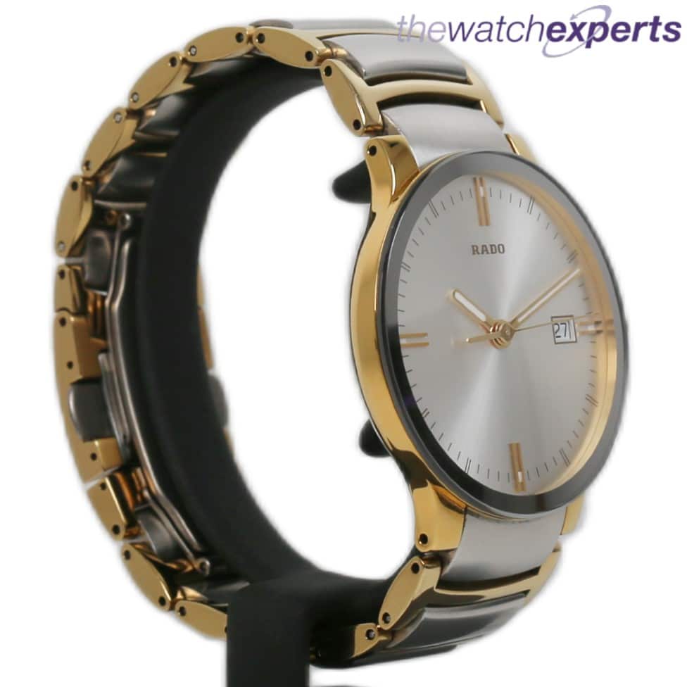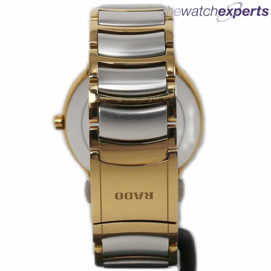 The 38mm Gold PVD and steel case houses the Swiss Rado quartz movement with silver dial, date aperture and gold framed hands. The Steel and gold PVD bracelet and double fold clasp sits at 160mm on the wrist (plus an extra 30mm in the spare links)