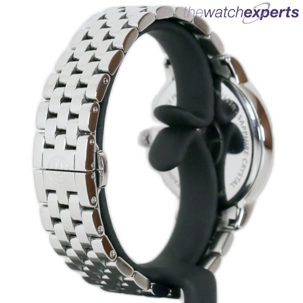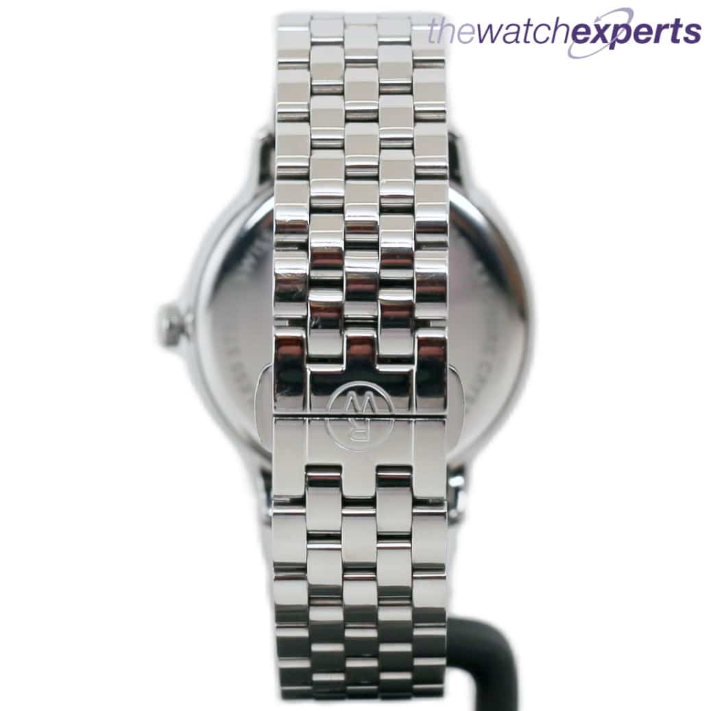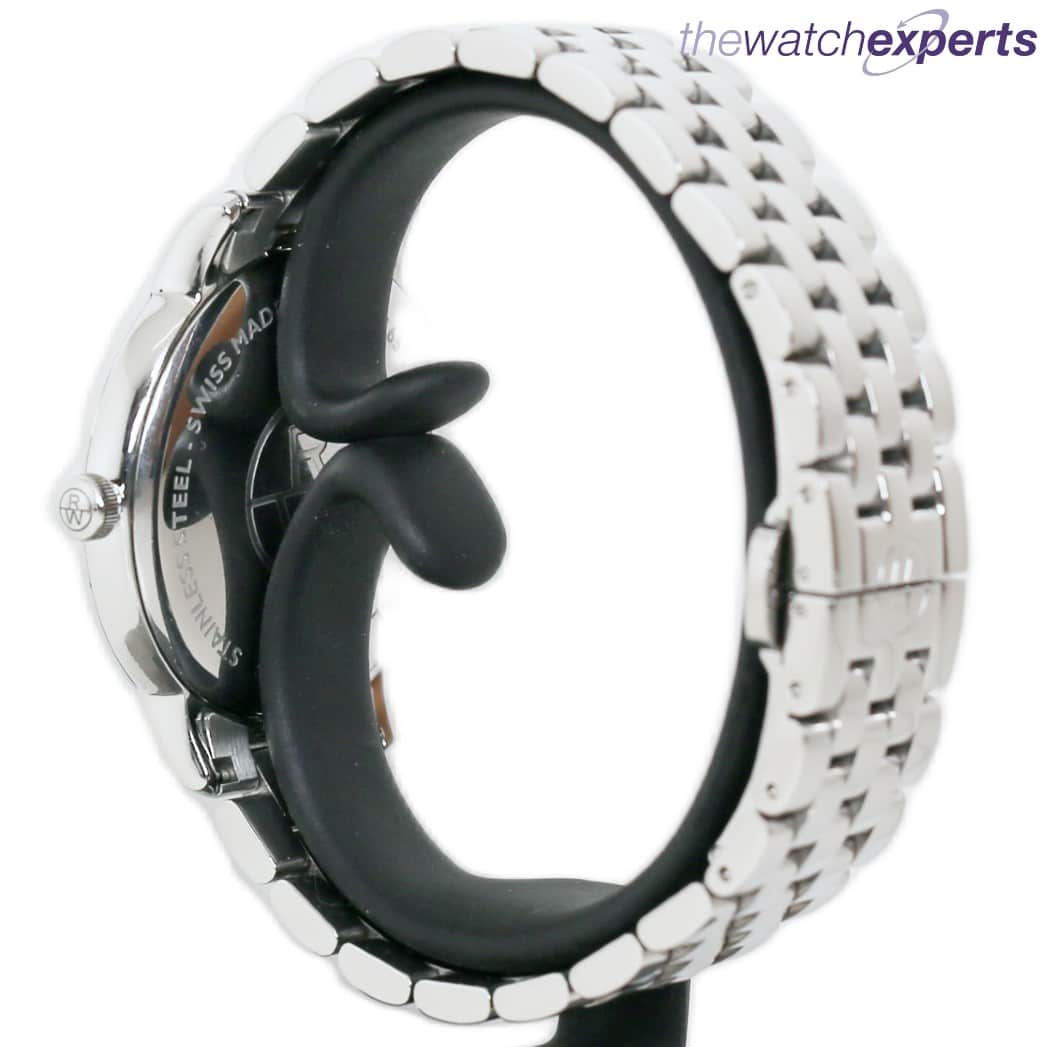 The 39mm stainless steel case with polished steel bezel houses a Swiss quartz movement with white dial, roman numerals and date aperture. The bracelet sits at 180mm on the wrist.
