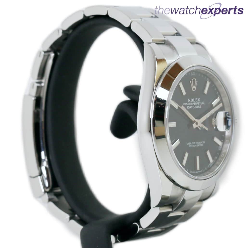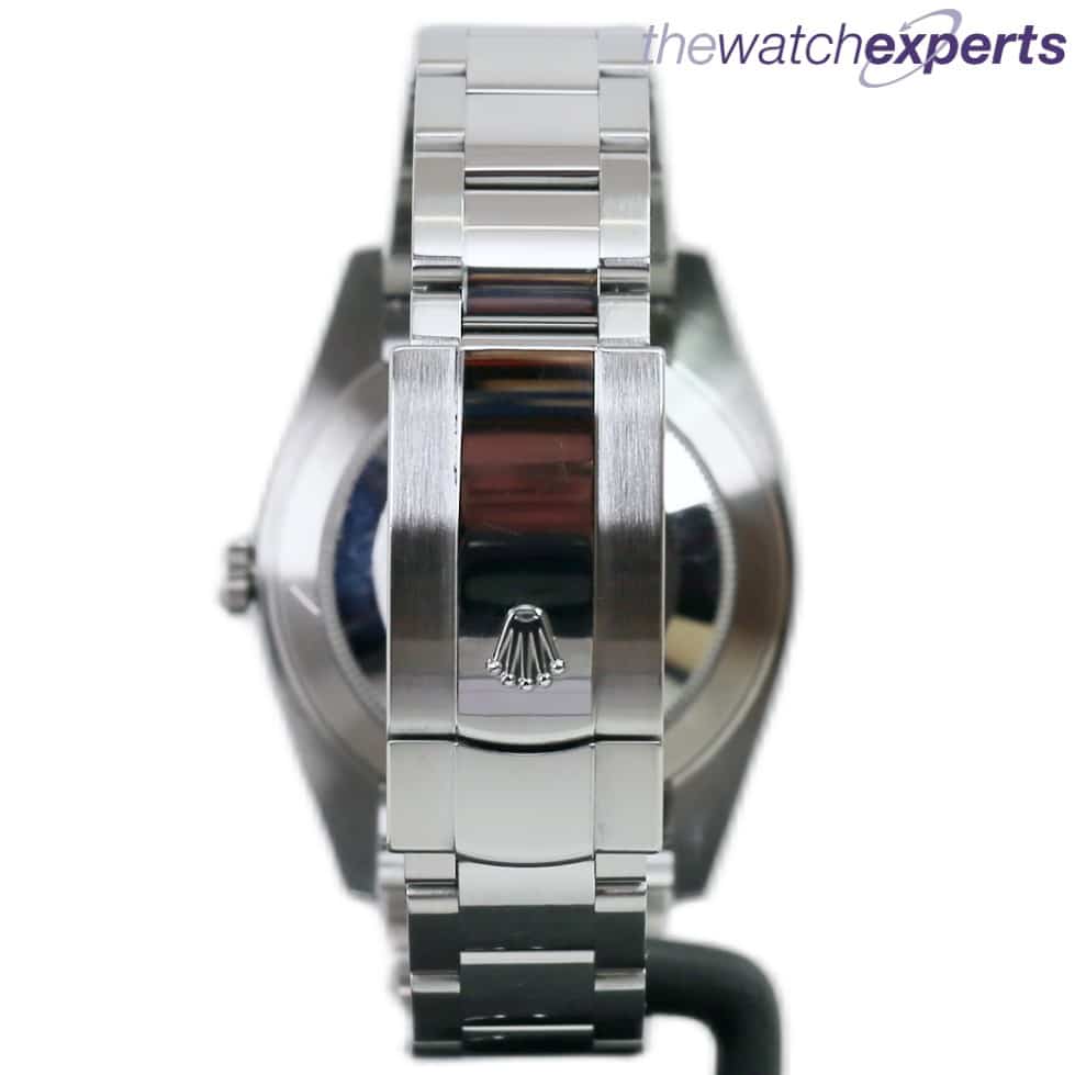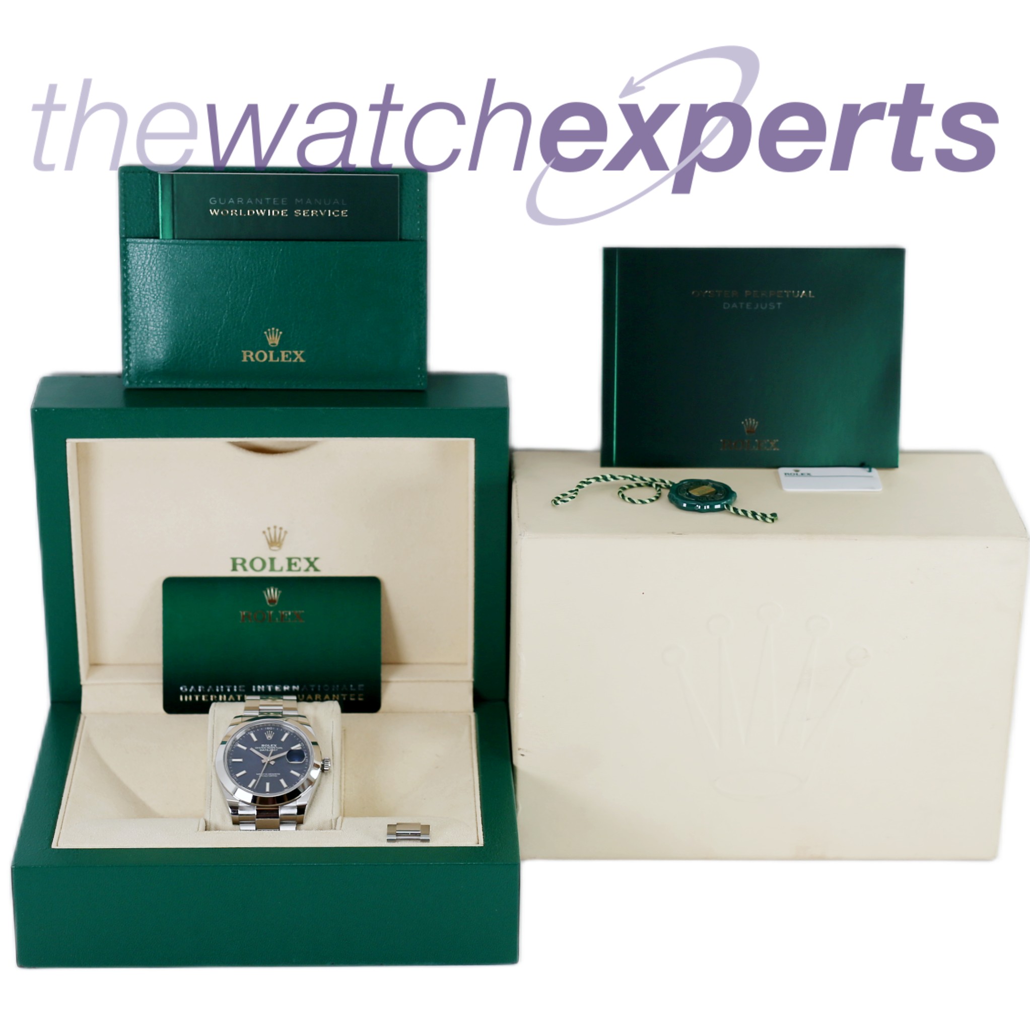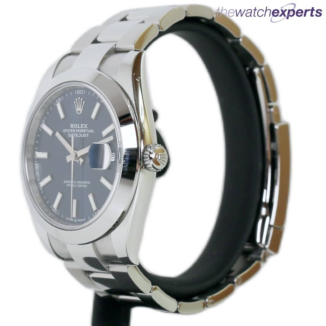 The 41mm stainless steel case houses a Rolex calibre 3235 automatic movement with quick set date function. The blue dial with silver and white baton hour markers is encircled within a polished steel bezel. The stainless steel oyster bracelet with folding clasp sits comfortably on the wrist at 185mm.