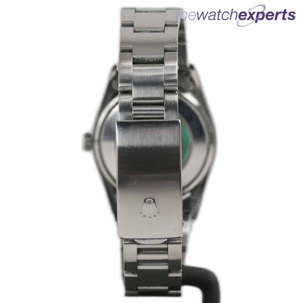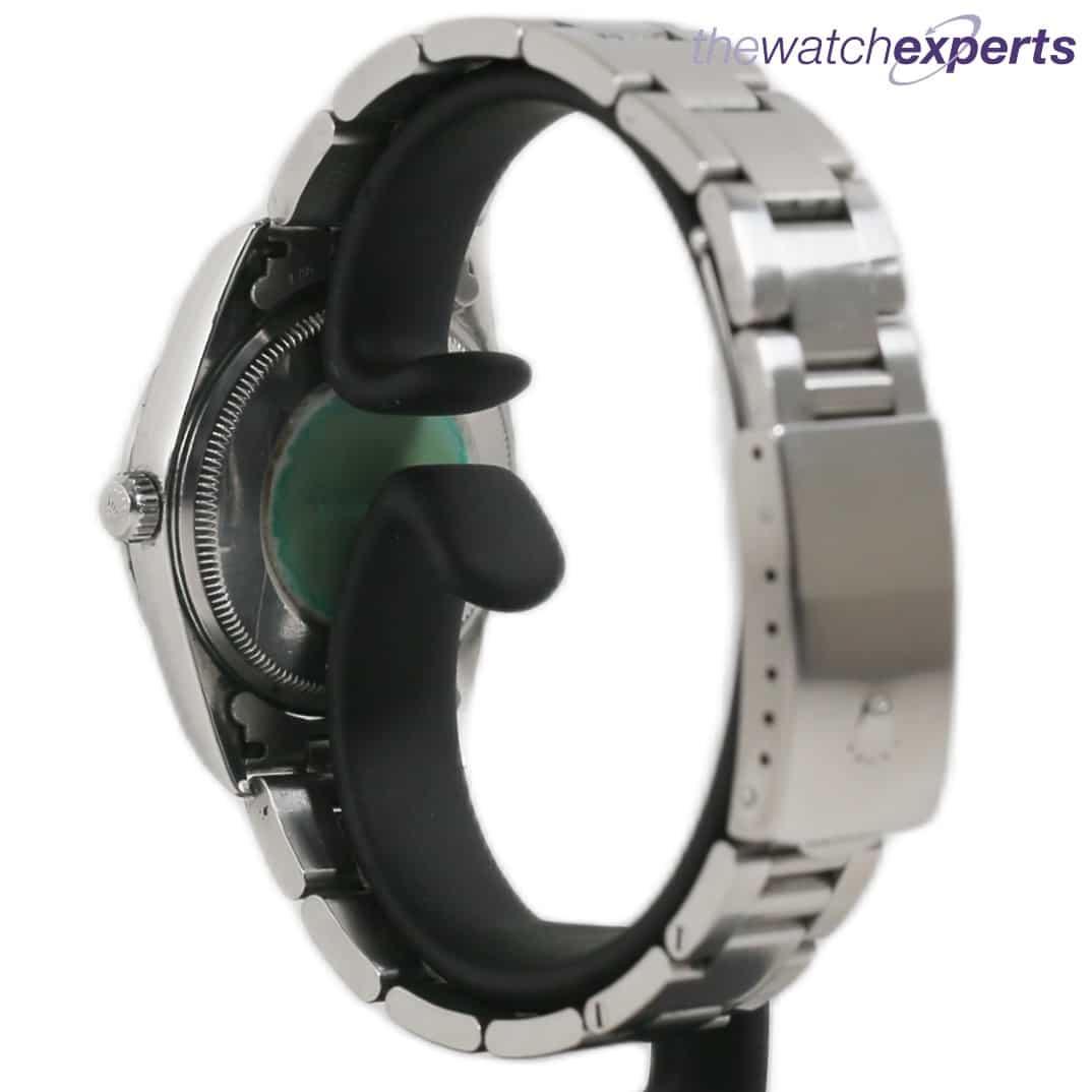 The 34mm stainless steel case with polished steel bezel houses a Rolex automatic movement and silver dial with silver batons. The steel oyster bracelet sits at 190mm on the wrist