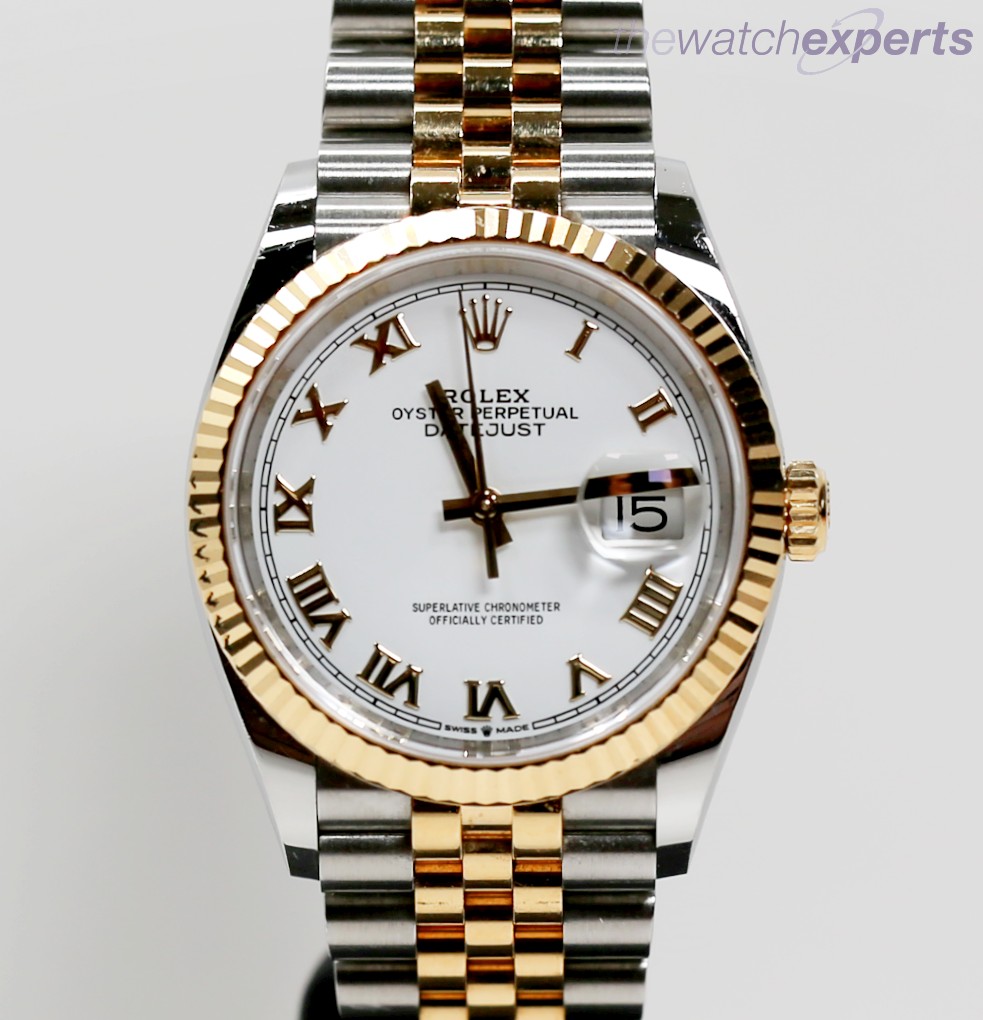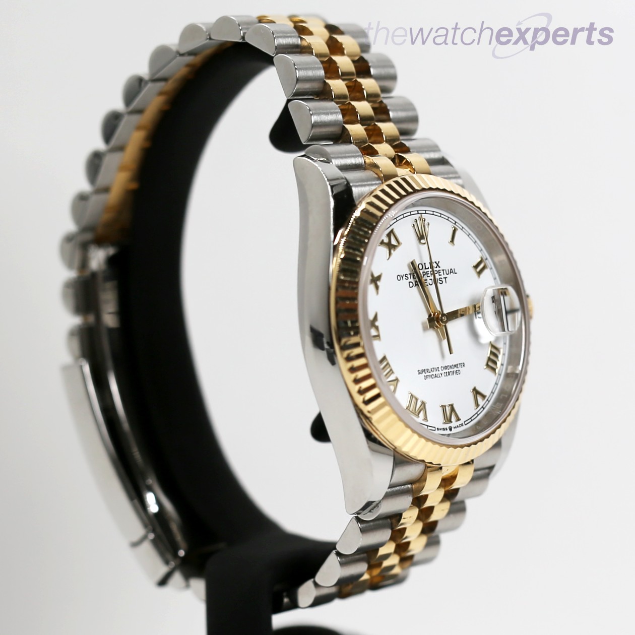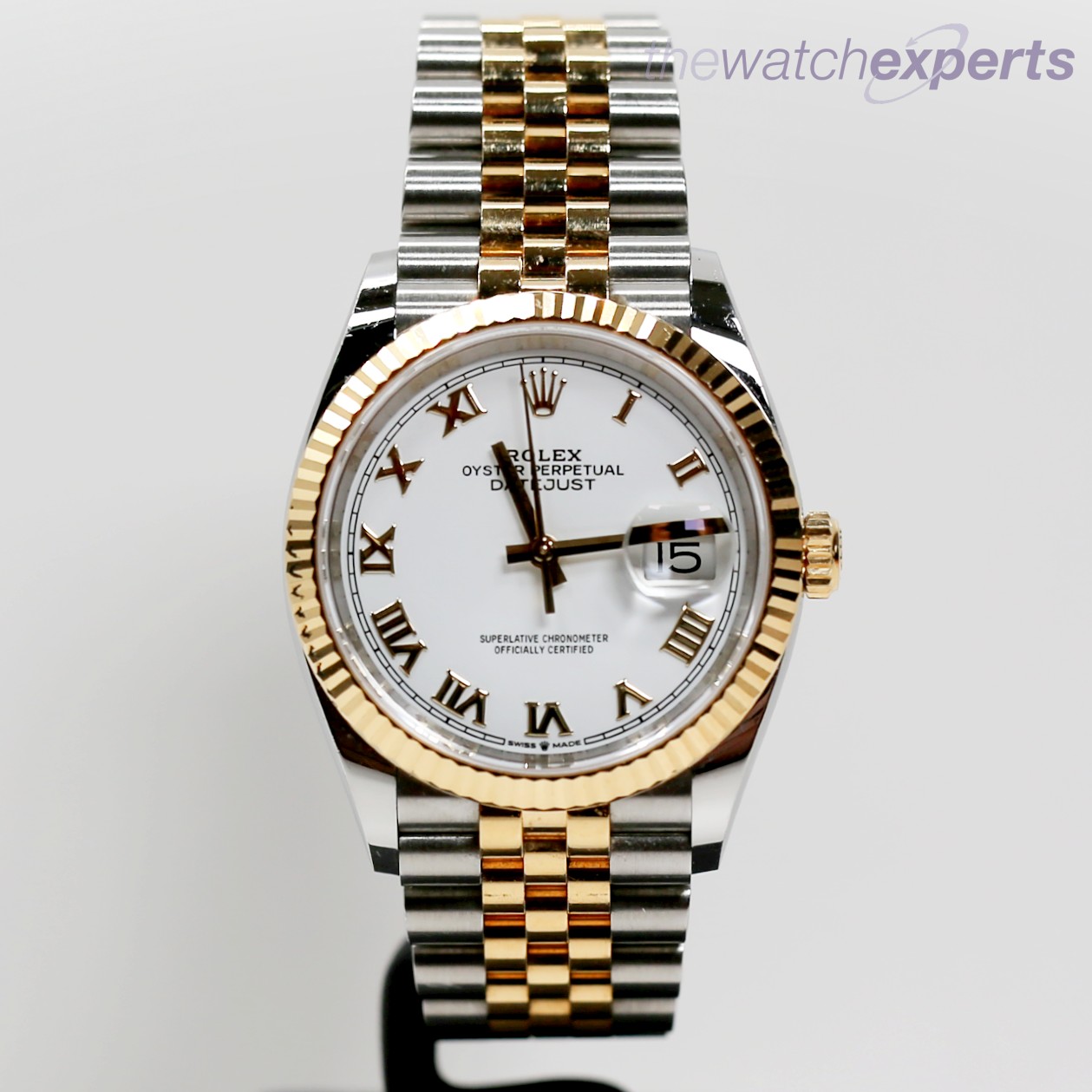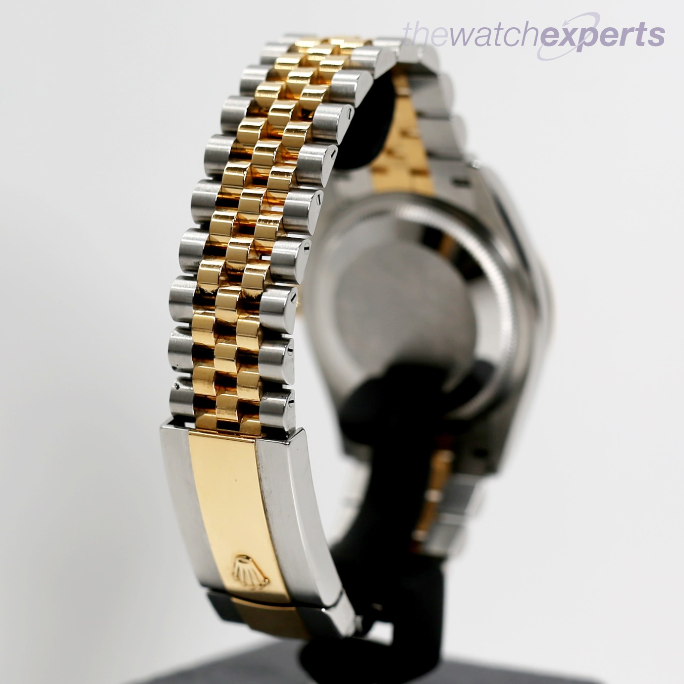 This 41mm diameter chronometer in stainless steel and yellow metal. The white dial with gold roman numerals shows time, centre seconds and date at 3 o’clock. Presented on a fine 180 mm Jubilee bracelet with Oysterclasp