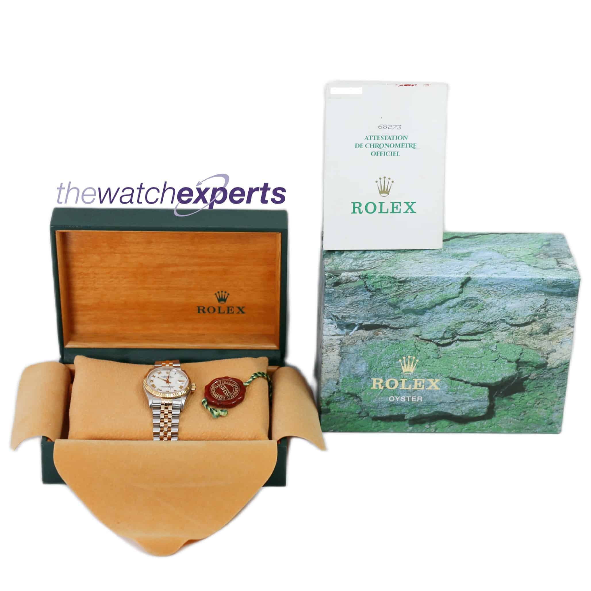 This Rolex Datejust 68273 comes complete with original box and guarantee certificate dated from 1997. It also has the original swing tag, pressure test and timergraph papers from February 2026, and watch register certificate.