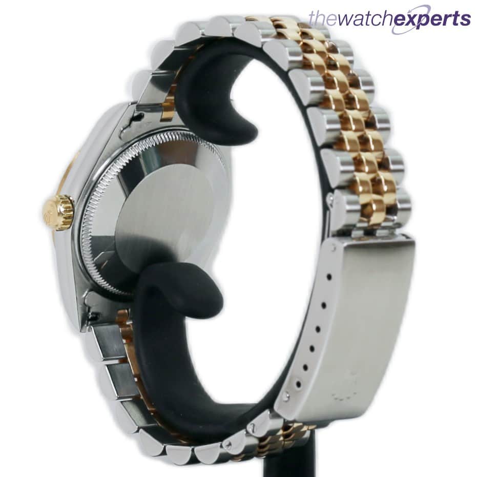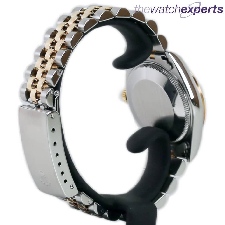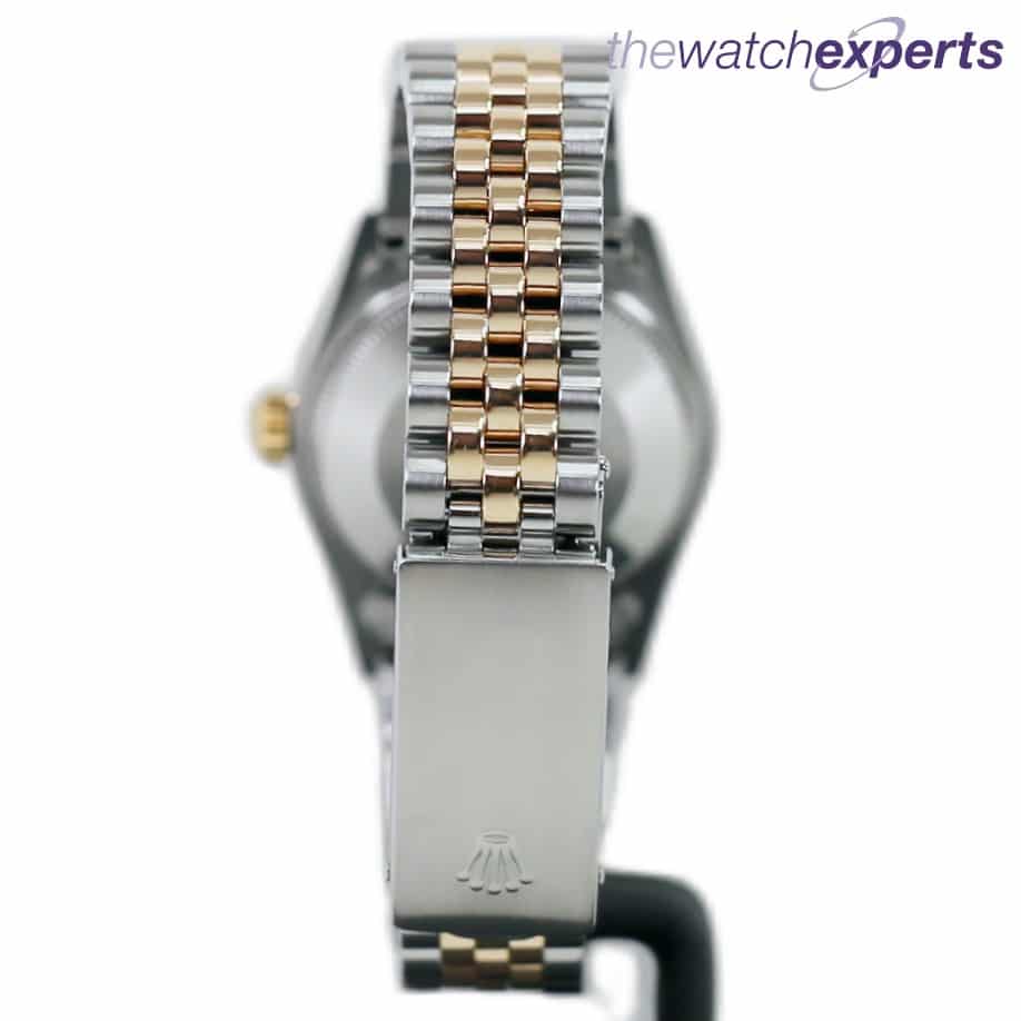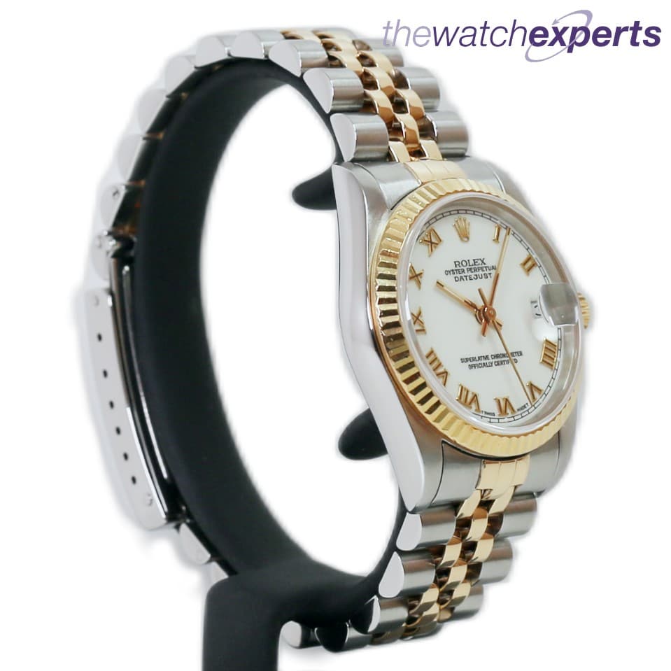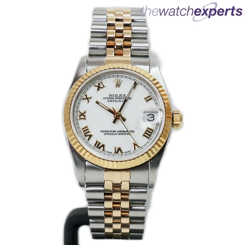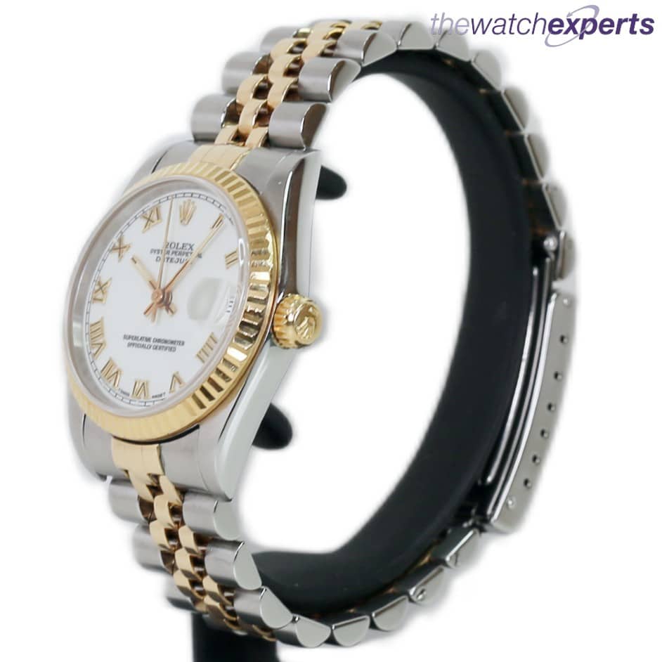 The 30mm stainless stell case houses a Rolex calibre 2135 automatic movement with date function. The white dial with gold roman numerals is encircled in an 18ct yellow gold fluted bezel. The stainless steel and gold jubilee bracelet with folding clasp sits comfortably on the wrist at 165mm.