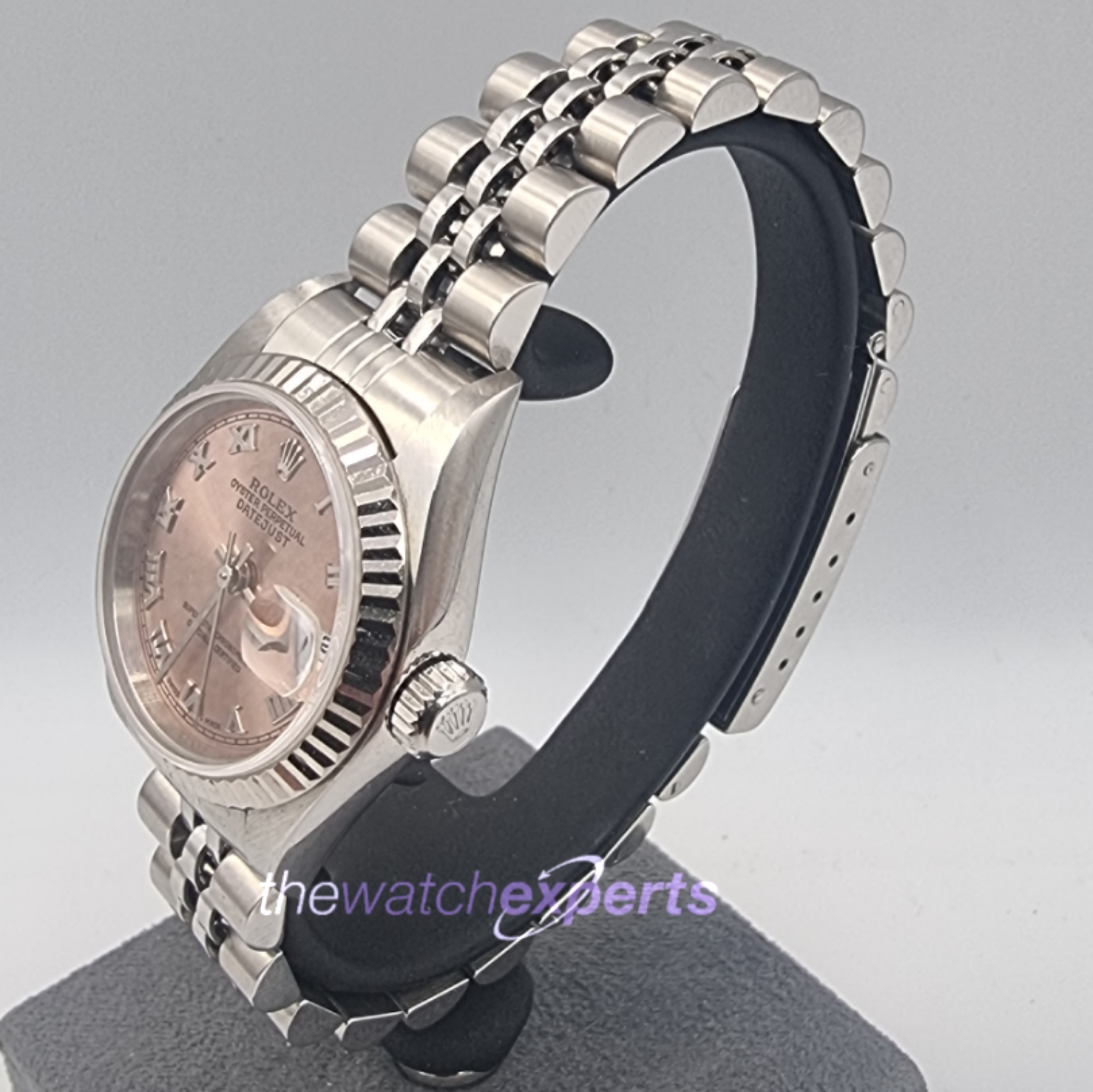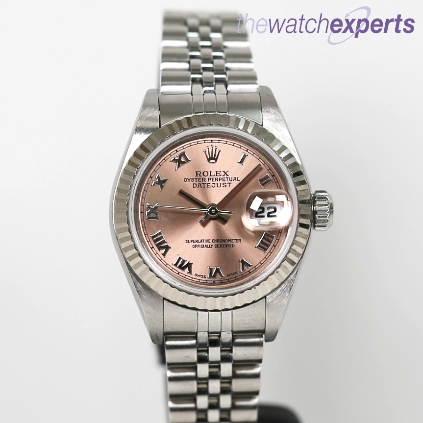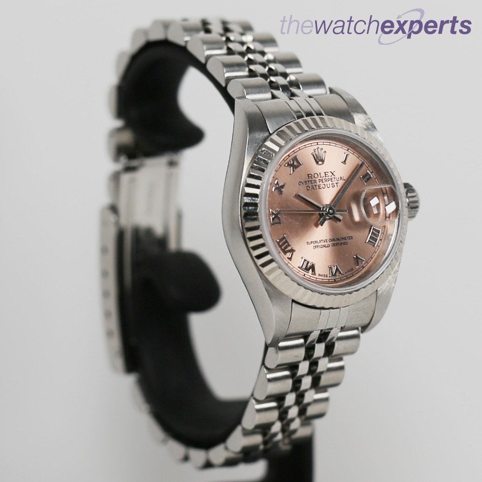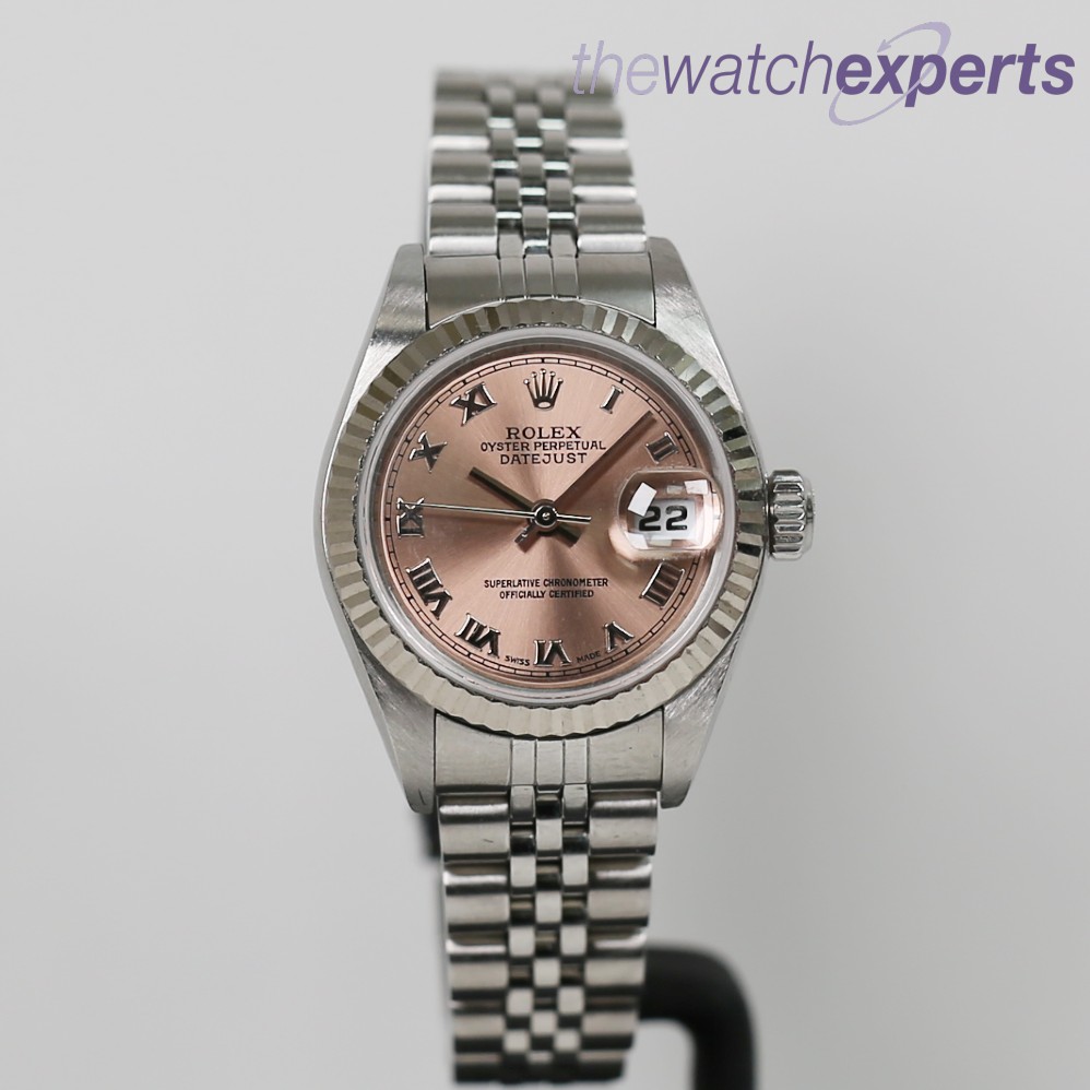 This stainless steel 26mm case with 18ct white fluted bezel has a pink roman dial, steel 170mm jubilee bracelet in great condition.