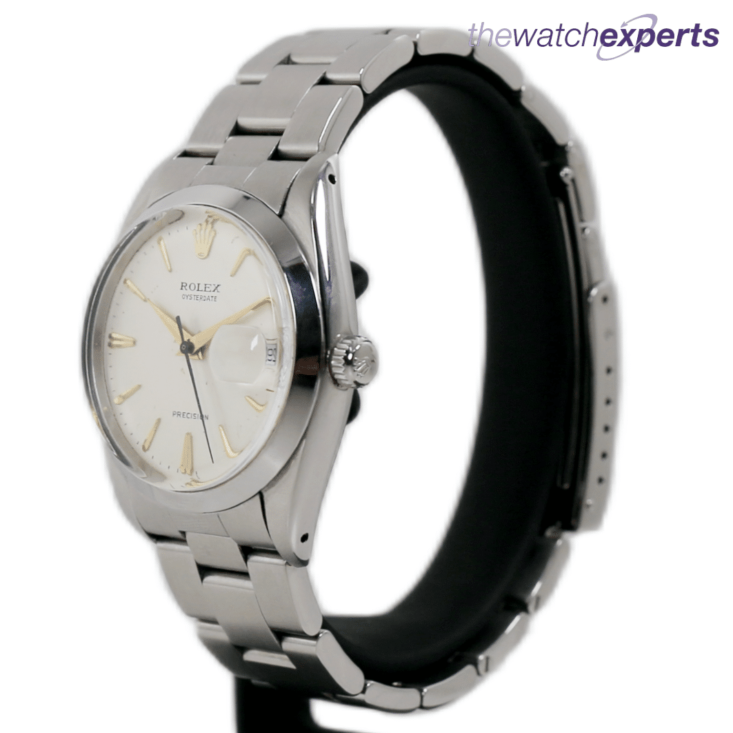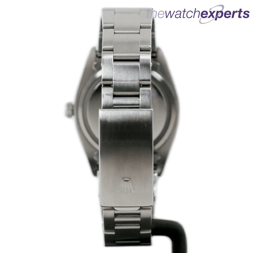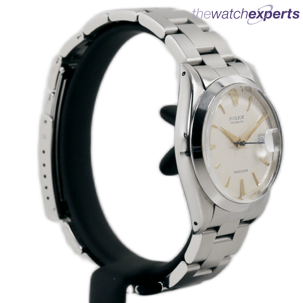 The 35mm stainless steel case with polished steel bezel houses a Swiss Rolex manual wind movement with silvered dial, gold coloured hands and indices and date aperture. The watch sits at 185mm on the wrist.