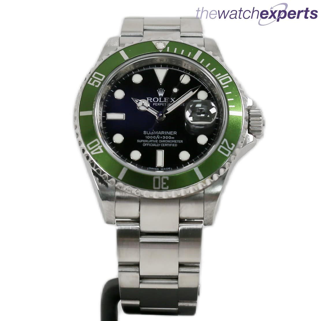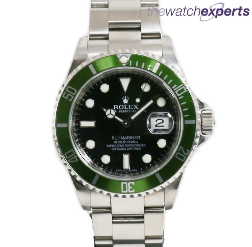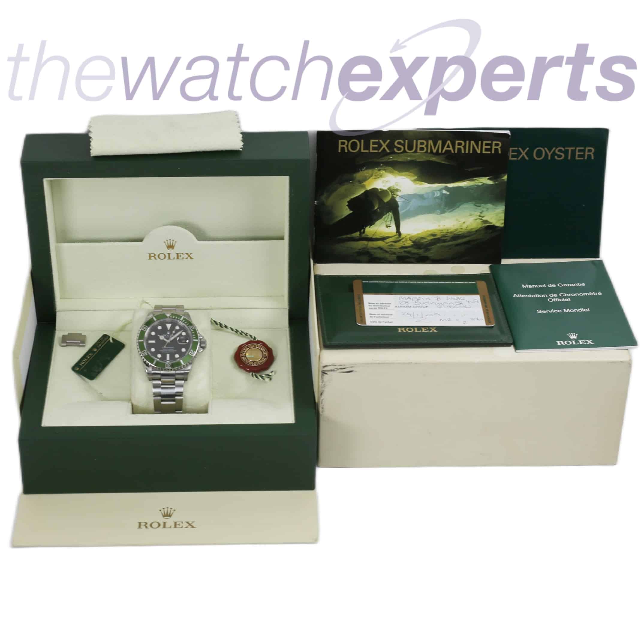 Nicknamed KERMIT with its green bezel and black dial, this Rolex Submariner 1610LV comes complete with Rolex box , tags and papers. Dated Jan 2009 (year of manufacture 2008)