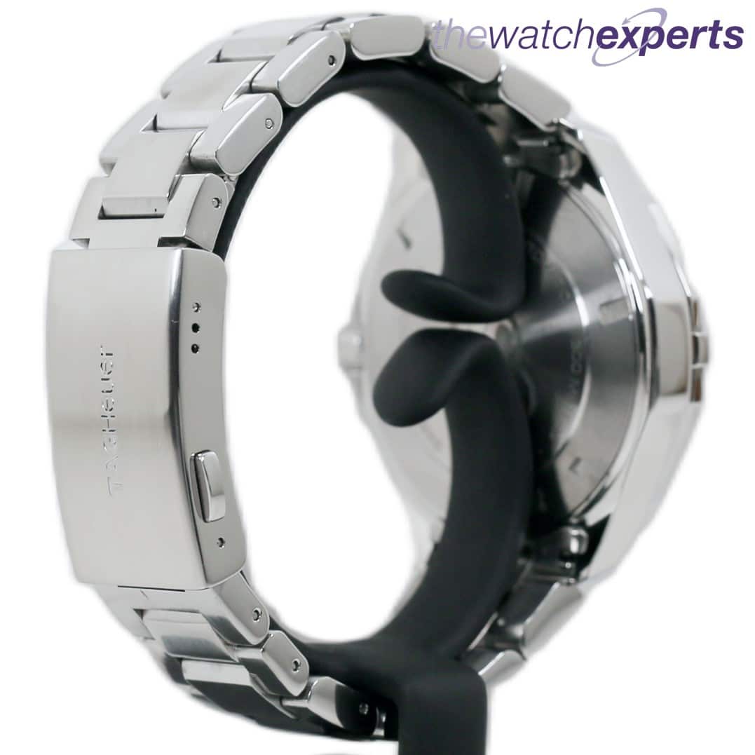 The stainless steel 44mm case with screw down crown and uni directional bezel, houses a Tag Swiss automatic movement with blue lined dial, silver and white indices and date aperture. The steel bracelet with locking folding clasp sits at 190mm.