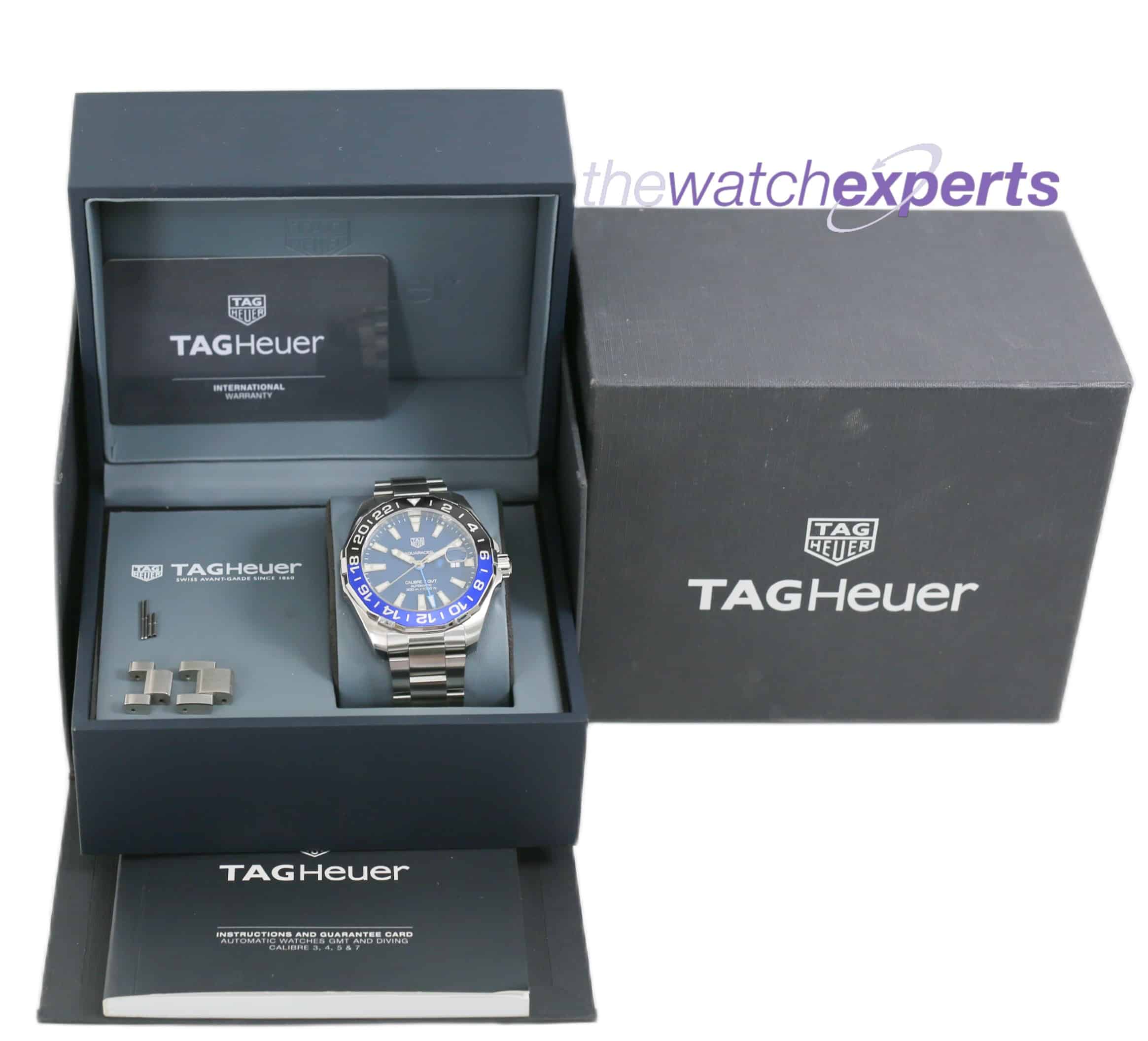 This Tag Heuer Aquaracer (Batgirl) Calibre 7 GMT WAY201T watch comes with original Tag Heuer box, booklet and warranty card with 2 spare links.