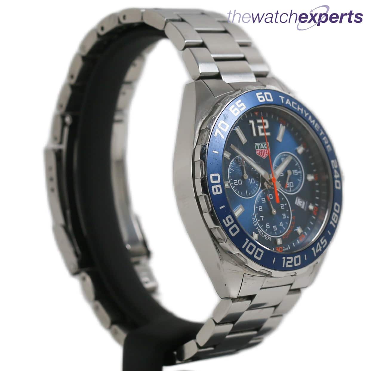 The stainless steel 43mm case with screw down crown and blue steel bezel, houses a Tag Swiss quartz chronograph movement with blue dial, silver framed indices, sub dials and date aperture. The stainless steel bracelet with locking fold clasp sits at 210mm on the wrist (not including extension).